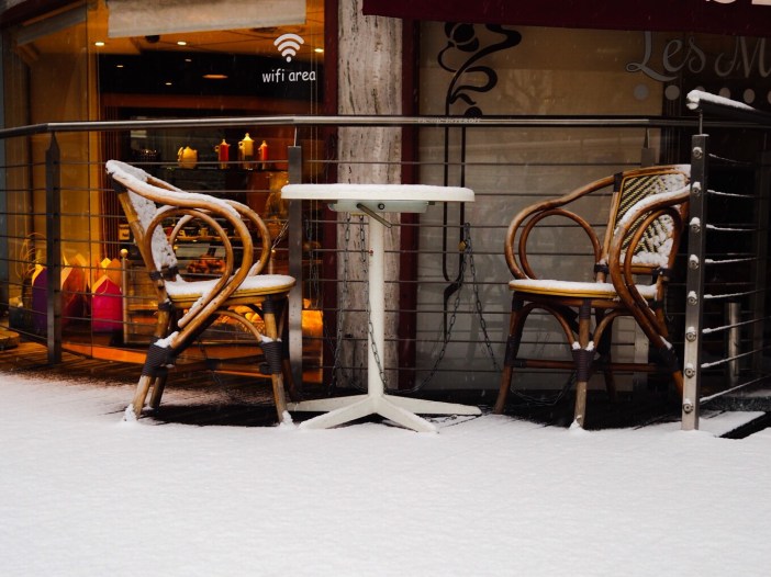 Même cette terrasse change d’aspect avec la neige. Je m’interroge : le besoin des fumeurs sera-t-il si fort jusqu’à en modifier ce décor ? Le mystère reste entier.